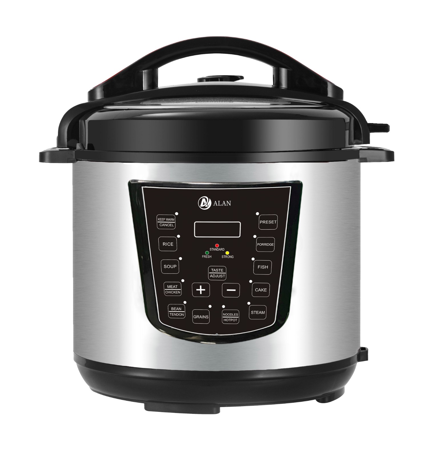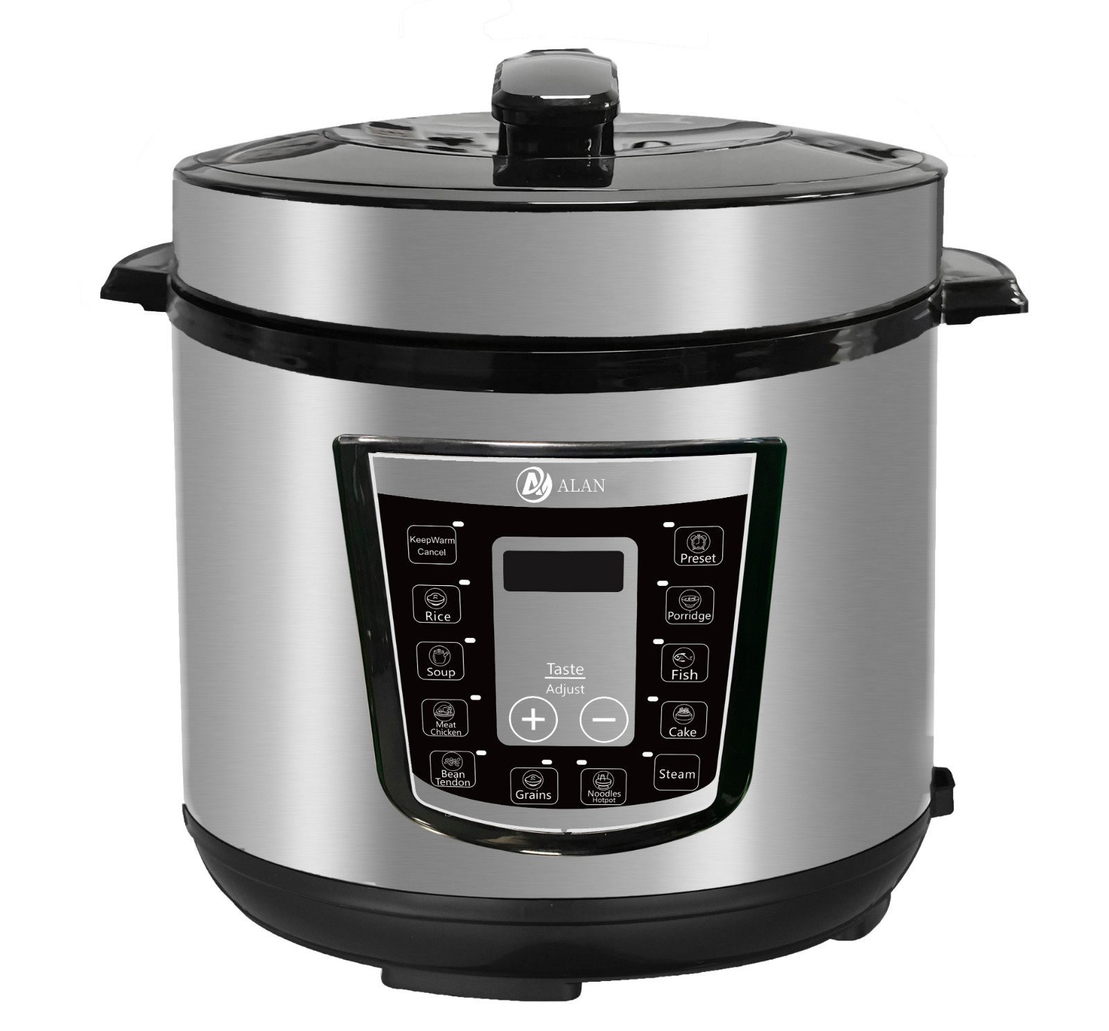 AL-S412-D08T 4/5/6/8/10/12L SS Microcomputer Housing EPC ◆ Voltage/Hz:220V~240V,50/60Hz ◆ Power:800/900/1000/1200/1600/1600W,0-70KPA ◆ Outer Housing:SS#410(Color Choice: Golden,Silver,Red,Purple,etc) ◆ Middle Housing:Cold Board ◆ Heater:380/430/430/630/1000/1000g ◆ Lid:SS#201 ◆ Inner Pot:No-Stick Aluminium Pot ◆ 3 Cores 1.0Meter Power Cable with Plug ◆ Accessories: Measure Cup, Spoon |