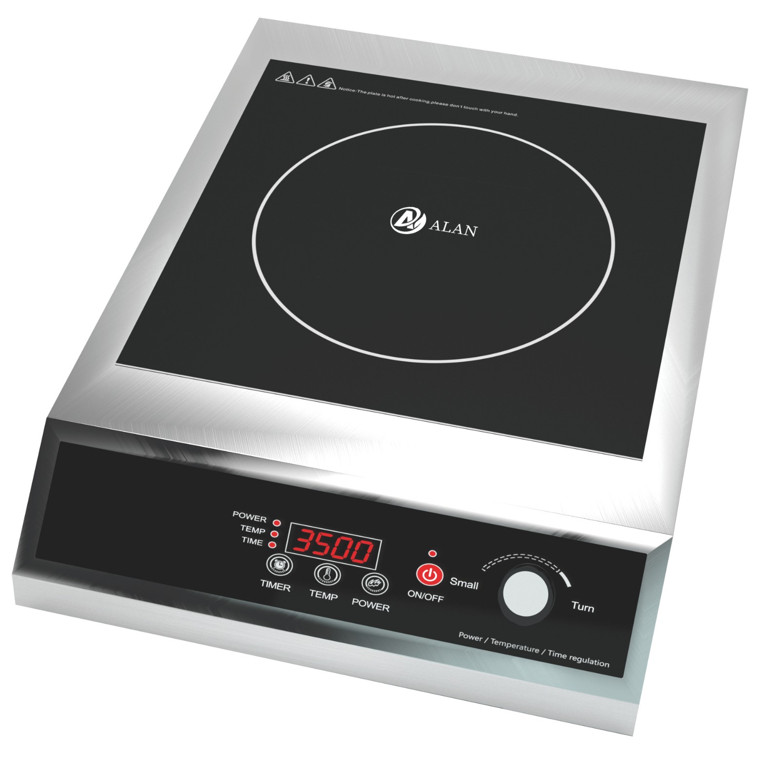 AL-3500K Knob Control Commercial Induction Cooker ◆ Rating Power: 3500W ◆ voltage: 220-240V/ 50-60Hz ◆ Grade A black crystal plate ◆ 4 digital LED display with multi-function ◆ 8 level of temperature and power ◆ Child Safety Lock ◆ 9 Intelligent Cooking Function ◆ Timer (0-240 minutes) and Preset (24 hours) ◆ Temperature Range 80℃-280℃ ◆ Glass Size(mm):300*300 ◆ Unit Size(mm): 320*420*105 |