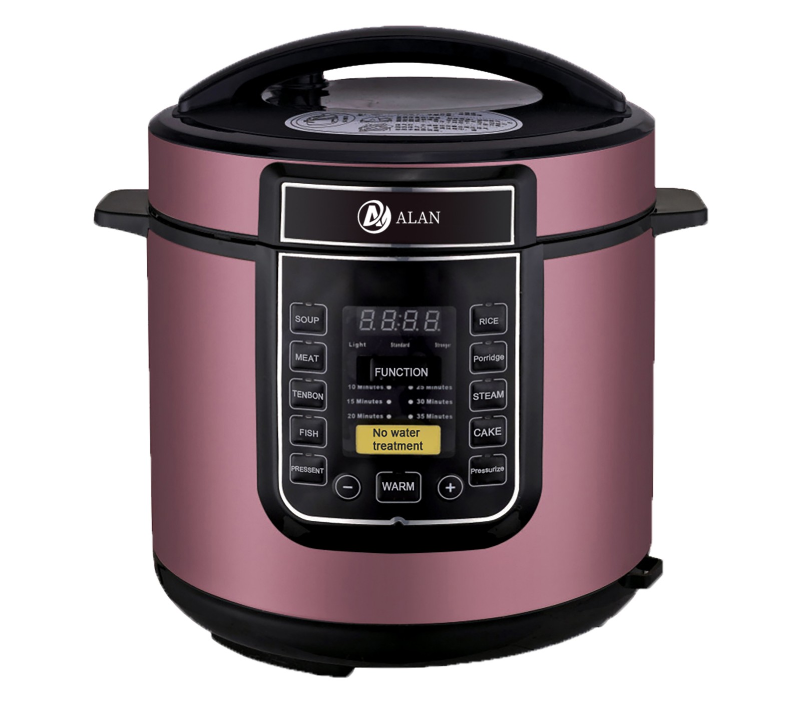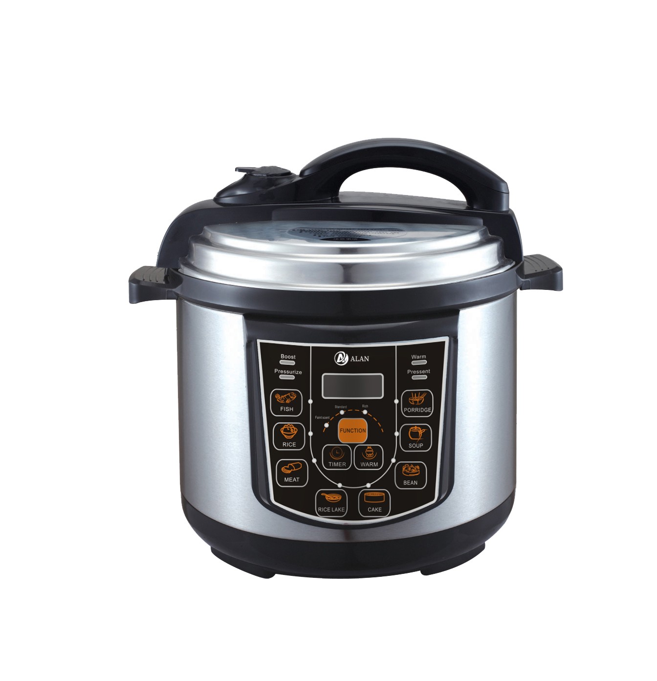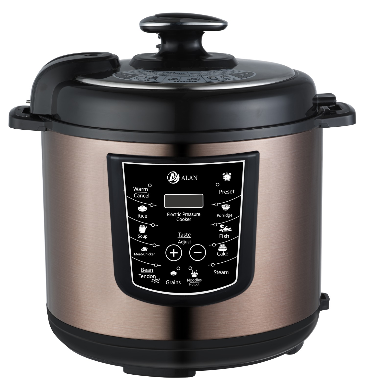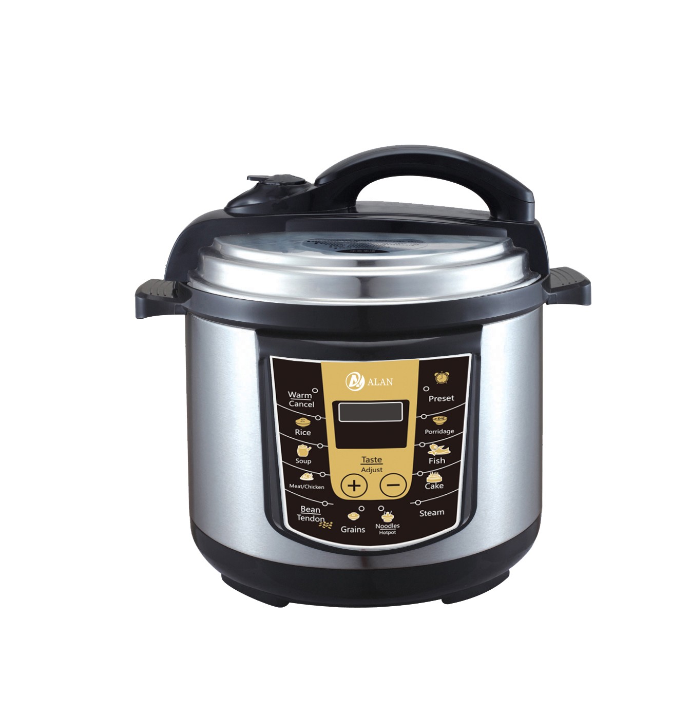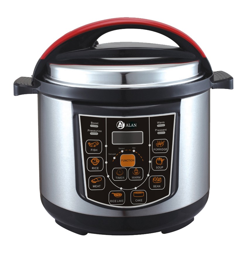 AL-S08 5/6L Microcomputer Electric Pressure Cooker ◆ Voltage/Hz:220V~240V,50/60Hz ◆ Power:900/1000W,0-70KPA ◆ Outer Housing:SS#201(Color Choice: Golden,Silver,Red,Purple,etc) ◆ Middle Housing:Cold Board ◆ Heater:430g ◆ Lid:SS#201 ◆ Inner Pot:Single Painting Aluminium Pot ◆ 3*0.75*1.0M Pure Copper Cable with VDE Plug ◆ Accessories: Measure Cup, Spoon |