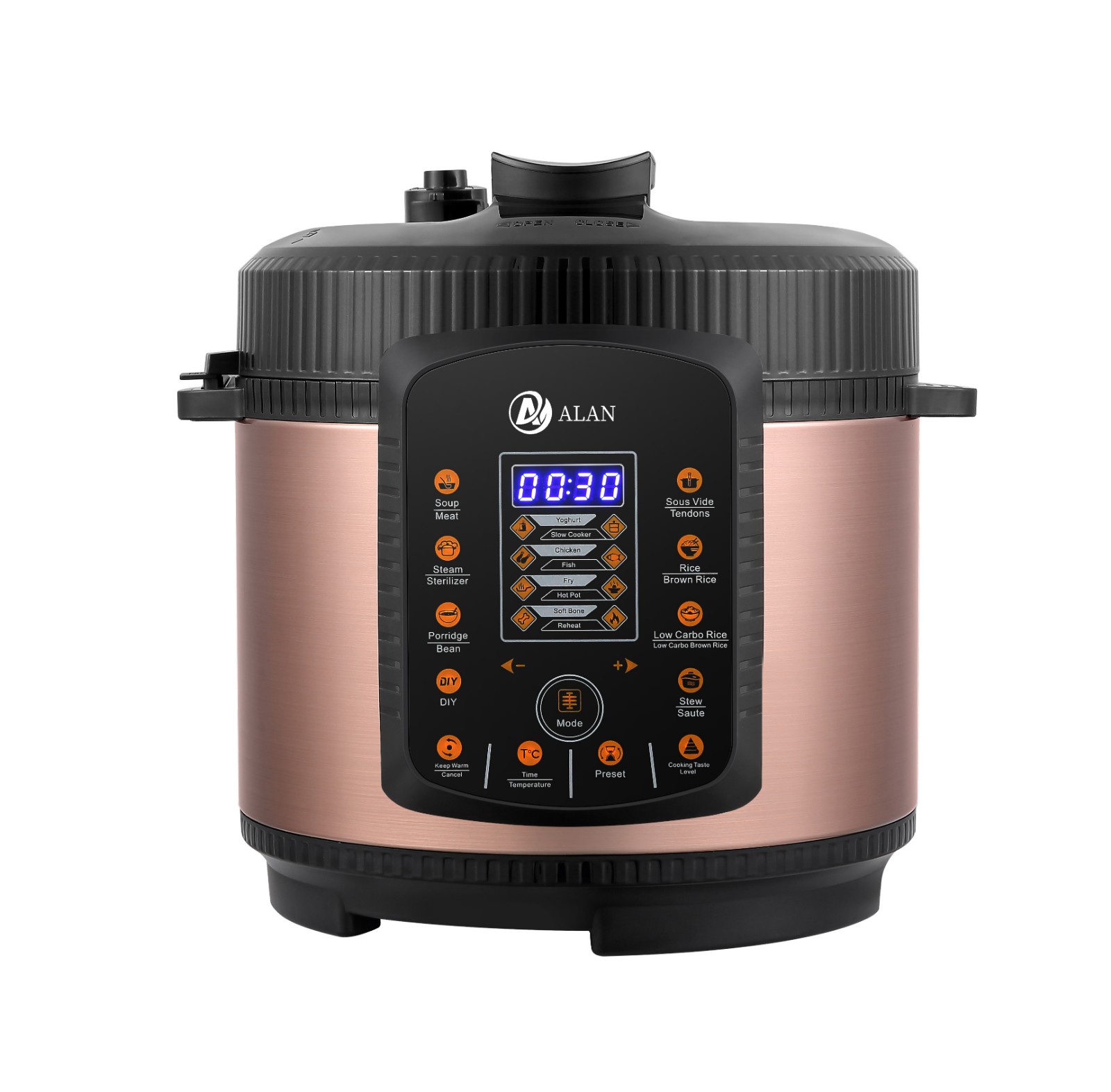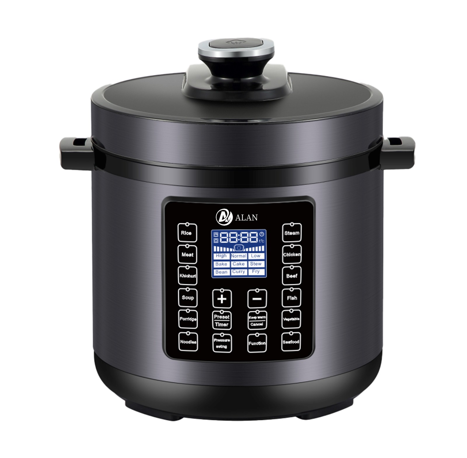 AL-A507 5/6L SS Housing EPC With LCD Screen ◆ Voltage/Hz:220V~240V,50/60Hz ◆ Power:900/1000W,0-70KPA ◆ Outer Housing:SS#410(Color Choice: Golden,Silver,Red,Purple,etc) ◆ Middle Housing:Cold Board ◆ Heater:430g ◆ Lid:SS#201 ◆ Inner Pot:Non-Stick Aluminium Pot ◆ 3*0.75*1.0M Copper Cable with Plug ◆ Accessories: Measure Cup, Spoon |