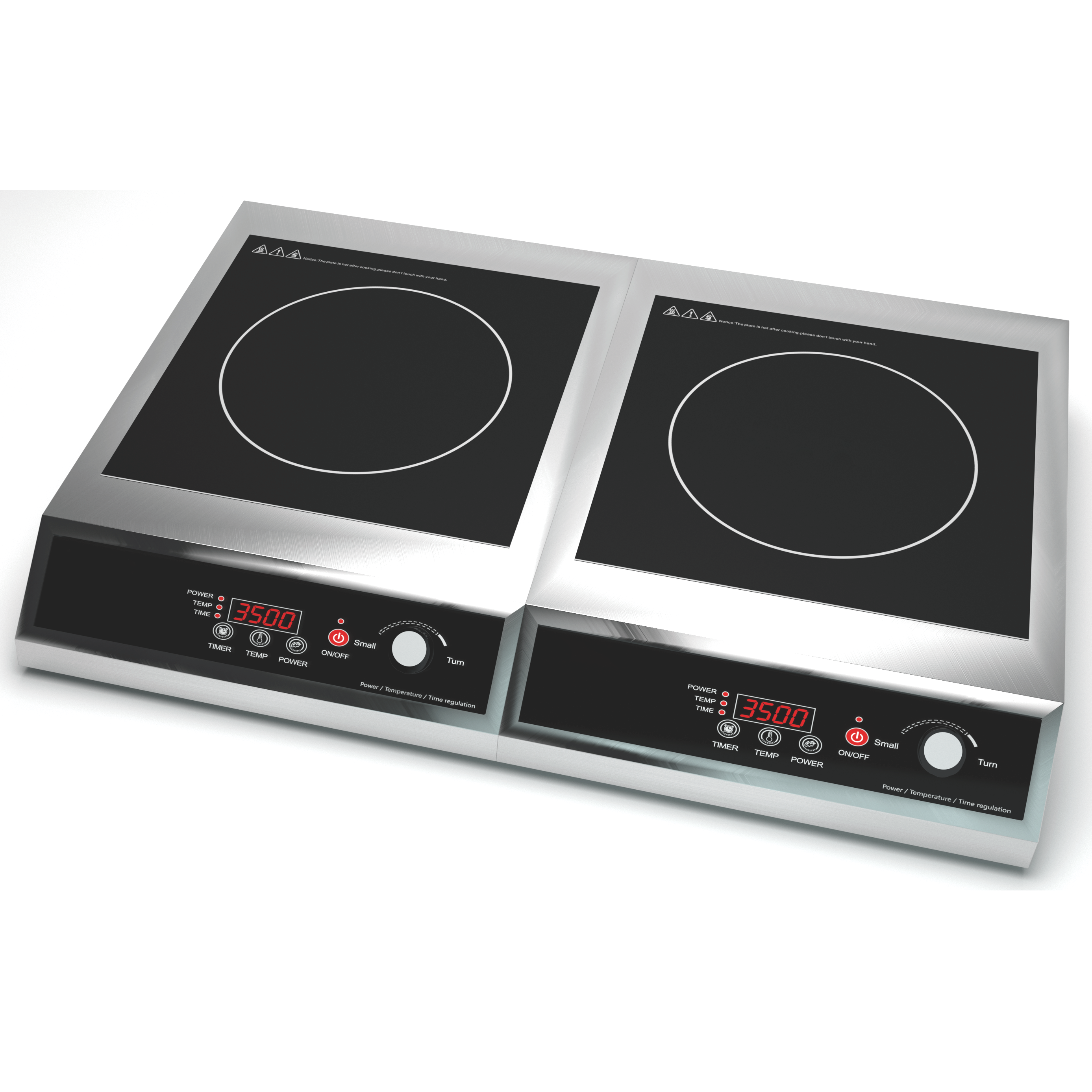 AL-H7000 Commercial Induction cooker,Knob Controller Four Digital Display 1) Voltage/Hz:220V~240V,50/60Hz 2) Voltage Range:L88V~H280V 3) Real Power:3500W+3500W 4) A-Grade Polished Black Crystal Plate 300*300mm 5) Pure Copper Coil 6) Big PCB Board 7) Housing Material:Stainless Steel 8) Product Size:780*356*87.5mm 9) Multi Intelligent Cooking Function 10) 9 Level Temperature & Power Adjustment 11) Power & Temperature Indication 12) Preset & Timer Function 13) Over Heat/Voltage/Current Protection 14) Auto shut off in 1 minute without Vessel 15) Without Pot 16) 1.5m Copper Cable without Plug |