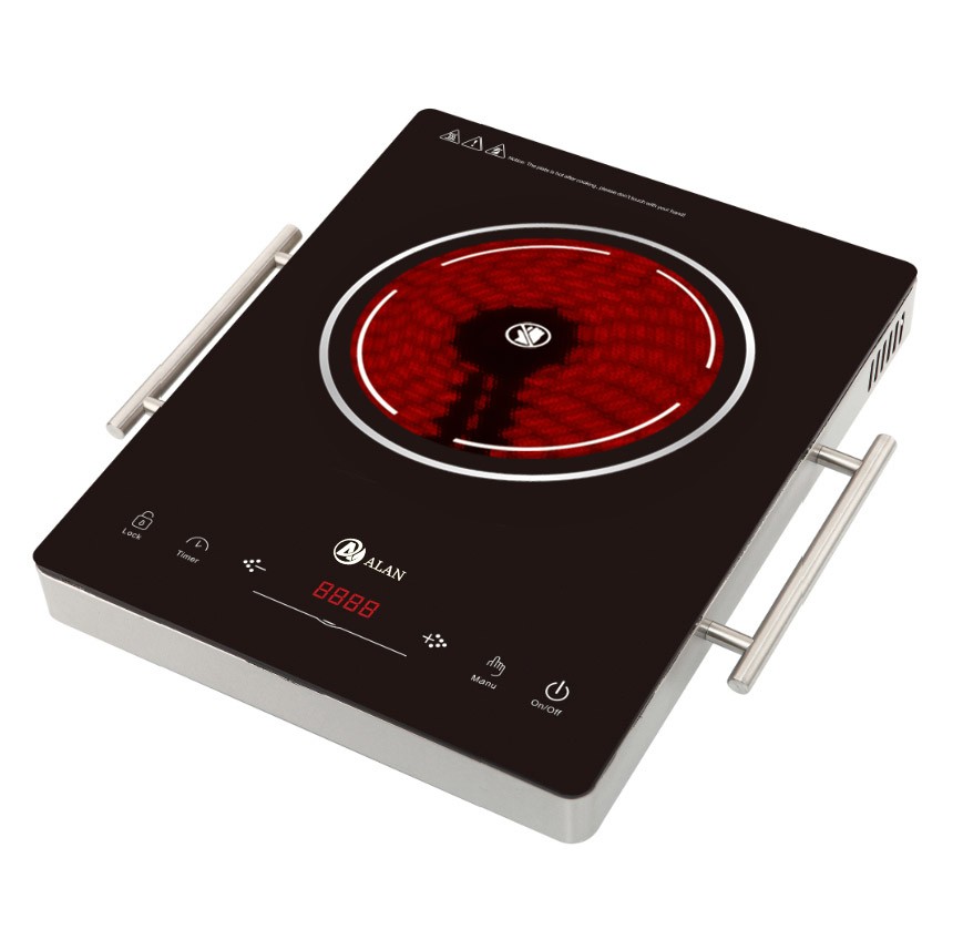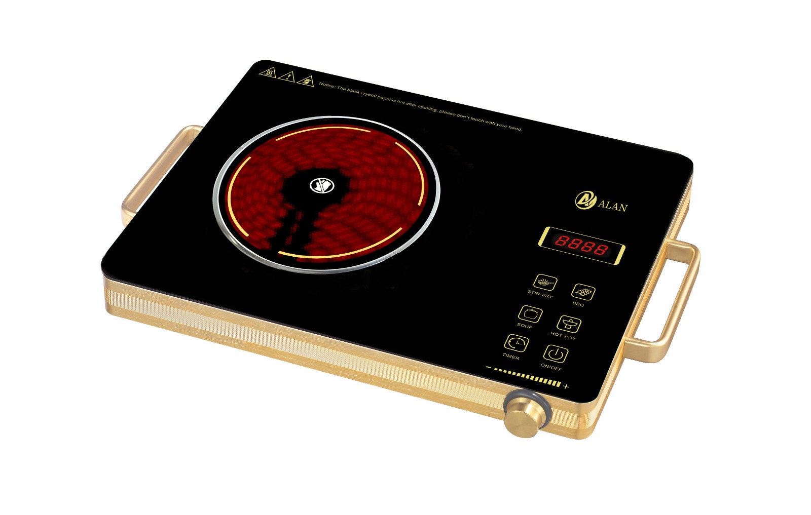 AL-871SR Infrared Cooker,Sensor Touch & Knob Controller Four Digital Display,NO RADIATION,Any Pot available 1) Voltage/Hz:220V~240V,50/60Hz 2) Voltage Range:L88V~H280V 3) Display 2200W 4) Tempered Glass 280*360mm+Black Crystal Plate 220mm 5) 2000W Heater of high efficiency 7) Housing Material:Metal Housing+Bottom 8) Product Size:280*360*65mm 9) 6 Intelligent Cooking Function 10) 8 Level Temperature & Power Adjustment 11) Power & Temperature Indication 12) Timer & Voltage Function 13) Safety Lock Function 14) Over Heat/Voltage/Current Protection 15) 1.5m Pure Copper Cable with VDE Plug |
